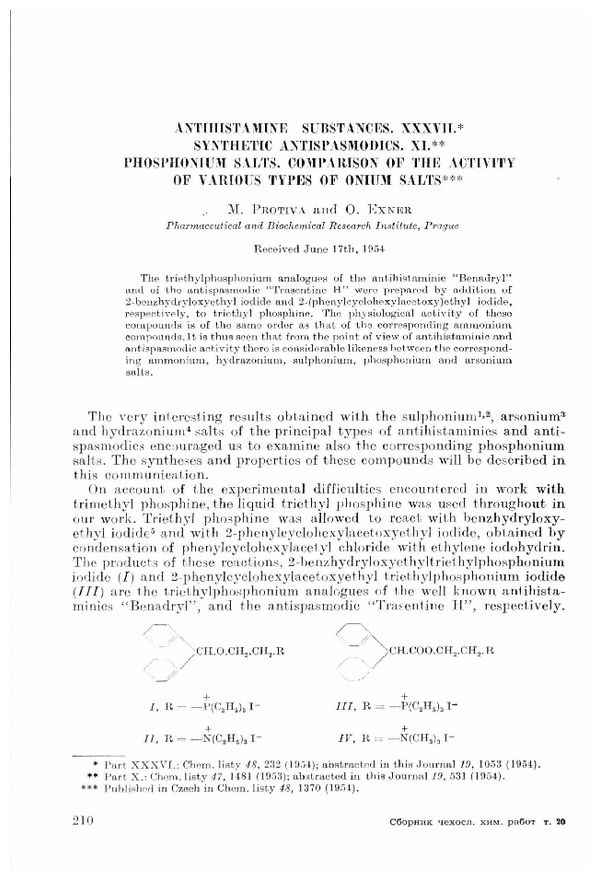 Antihistamine substances. XXXVII. Synthetic antispasmodics. XI. Phosphonium salts. Comparison of the activity of various types of onium salts