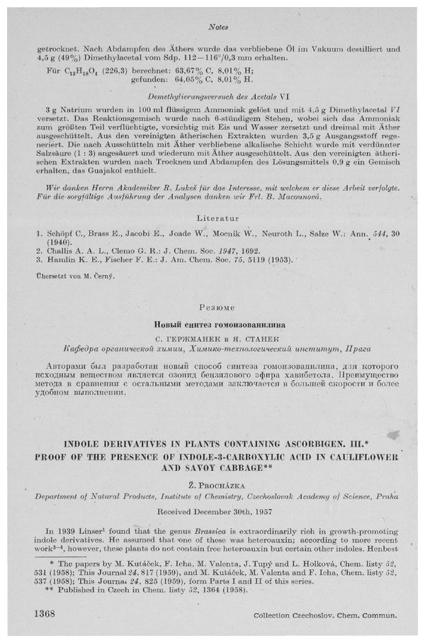 Indole derivatives in plants containing ascorbigen. III. Proof of the presence of indole-3-carboxylic acid in cauliflower and Savoy cabbage