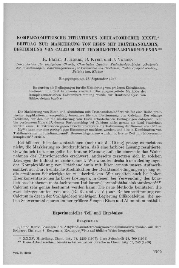 Komplexometrische Titrationen (Chelatometrie) XXXVI. Beitrag zur Maskierung von Eisen mit Triäthanolamin; Bestimmung von Calcium mit Thymolphthaleinkomplexon