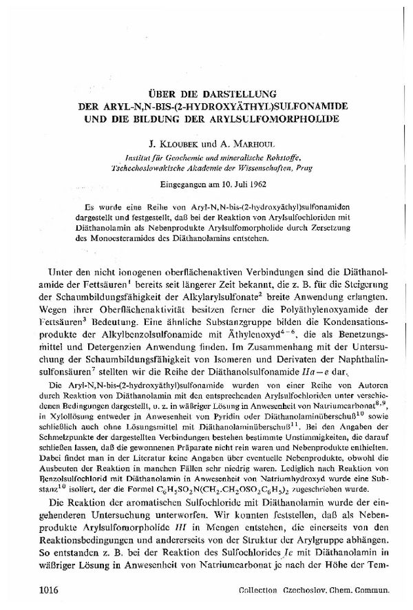 Über die Darstellung der Aryl-N,N-bis-(2-hydroxyäthyl)sulfonamide und die Bildung der Arylsulfomorpholide