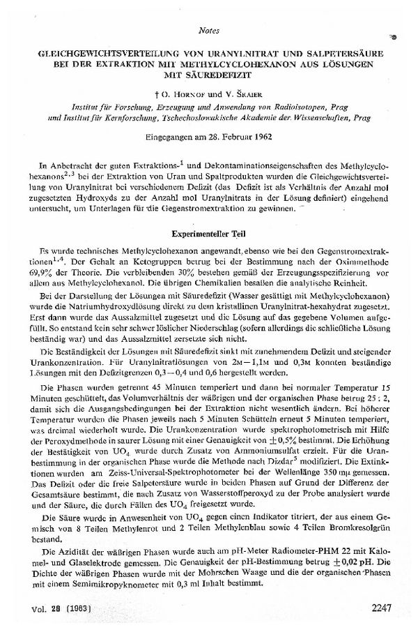 Gleichgewichtsverteilung von Uranylnitrat und Salpetersäure bei der Extraktion mit Methylcyclohexanon aus Lösungen mit Säuredefizit