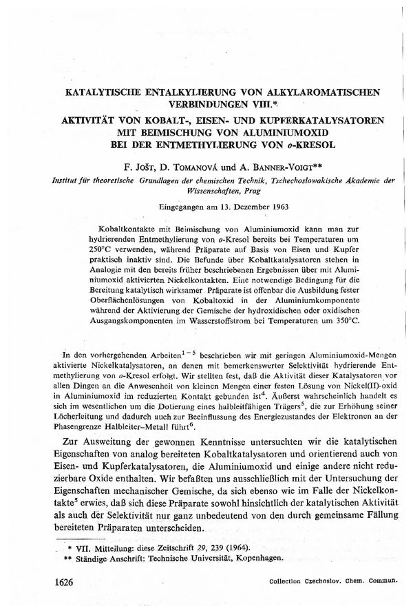 Katalytische Entalkylierung von alkylaromatischen Verbindungen VIII. Aktivität von Kobalt-, Eisen- und Kupferkatalysatoren mit Beimischung von Aluminiumoxid bei der Entmethylierung von o-Kresol