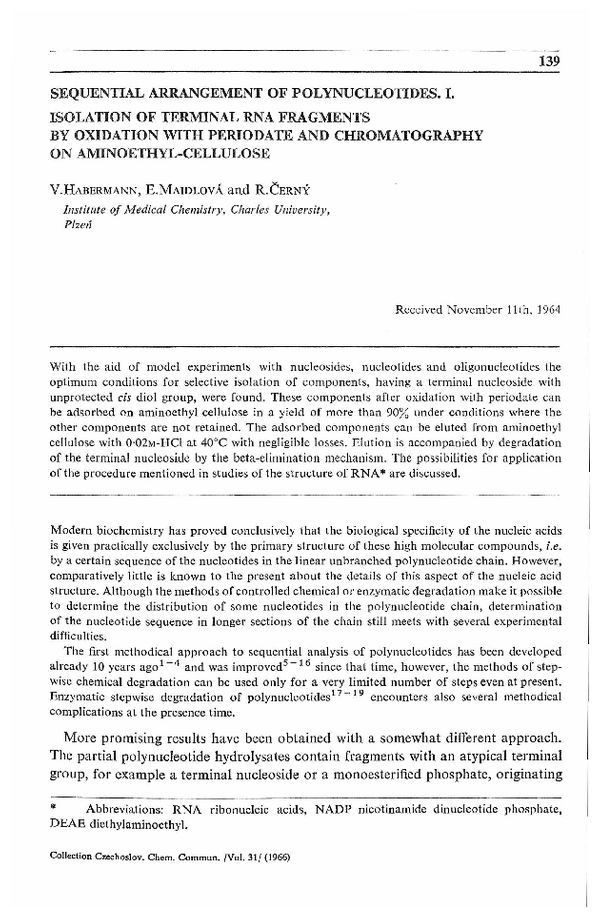 Sequential arrangement of polynucleotides. I. Isolation of terminal RNA fragments by oxidation with periodate and chromatography on aminoethyl-cellulose
