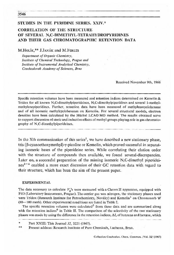 Studies in the pyridine series. XXIV. Correlation of the structure of several N,C-dimethyltetrahydropyridines and their gas chromatographic retention data