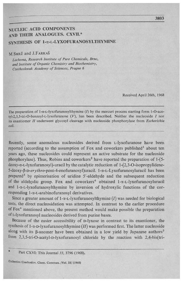 Nucleic acid components and their analogues. CXVII. Synthesis of 1-α-L-lyxofuranosylthymine