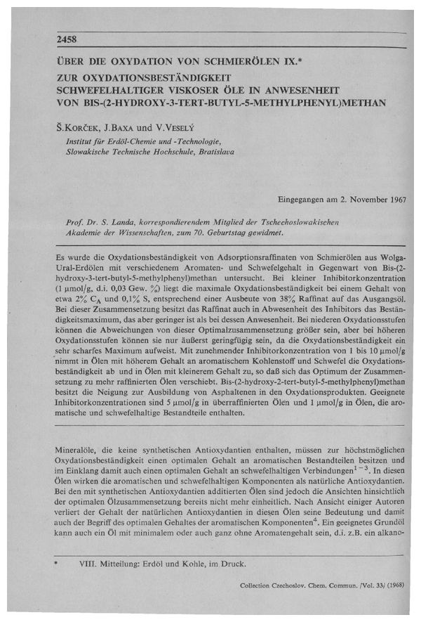 Über die Oxydation von Schmierölen IX. Zur Oxydationsbeständigkeit schwefelhaltiger viskoser Öle in Anwesenheit von Bis-(2-hydroxy-3-tert-butyl-5-methylphenyl)methan