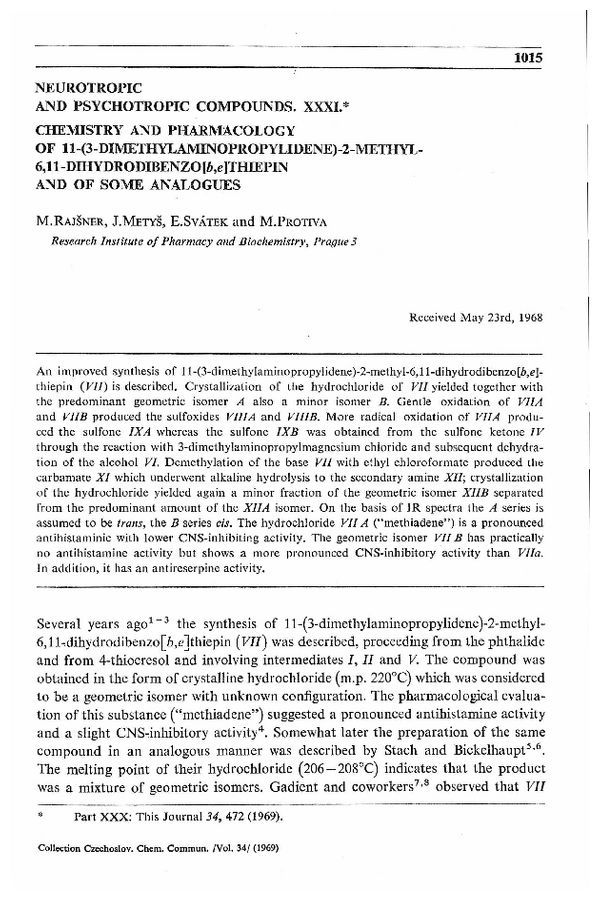 Neurotropic and psychotropic compounds. XXXI. Chemistry and pharmacology of 11-(3-dimethylaminopropylidene)-2-methyl-6,11-dihydrodibenzo[b,e]thiepin and of some analogues