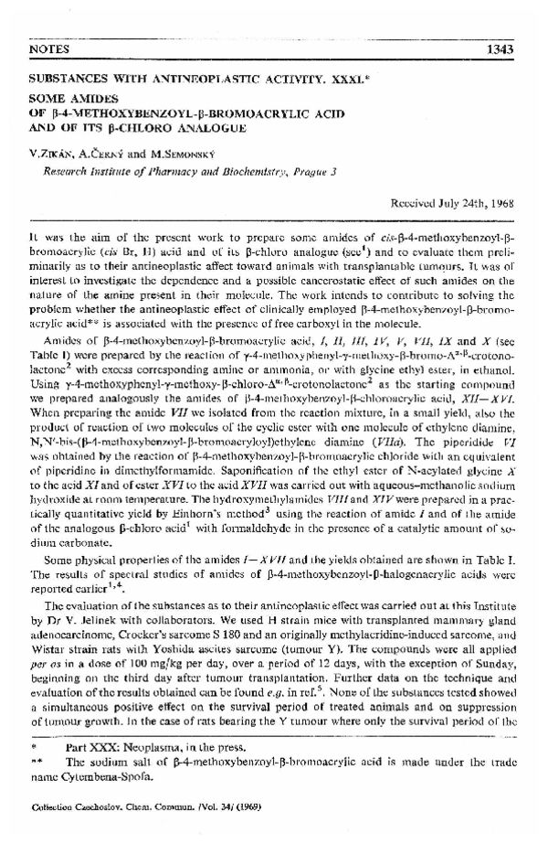 Substances with antineoplastic activity. XXXI. Some amides of β-4-methoxybenzoyl-β-bromoacrylic acid and of its β-chloro analogue