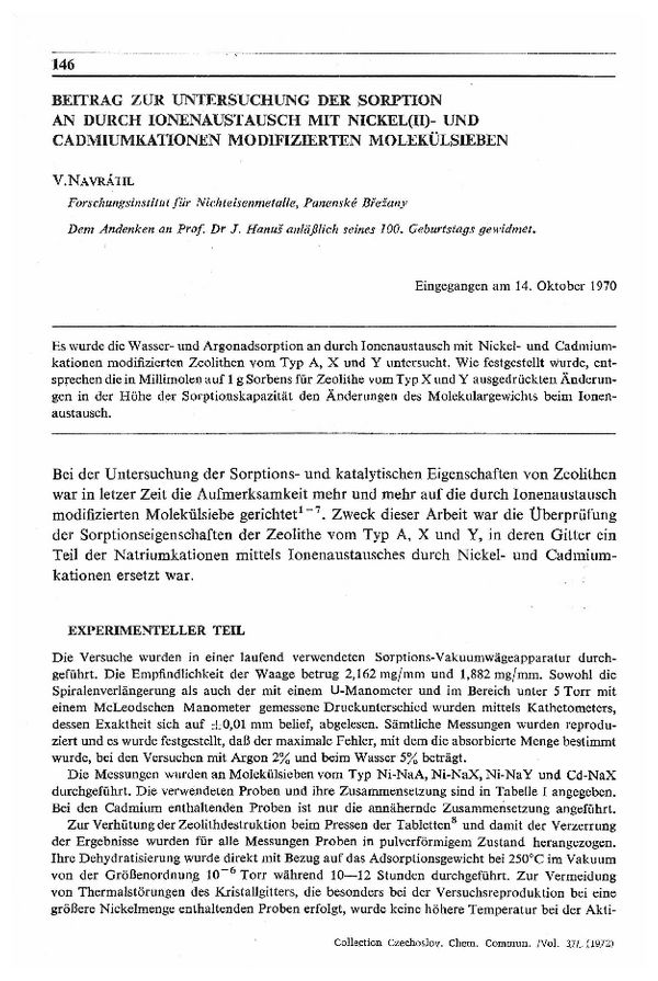 Beitrag zur Untersuchung der Sorption an durch Ionenaustausch mit Nickel(II)- und Cadmiumkationen modifizierten Molekülsieben