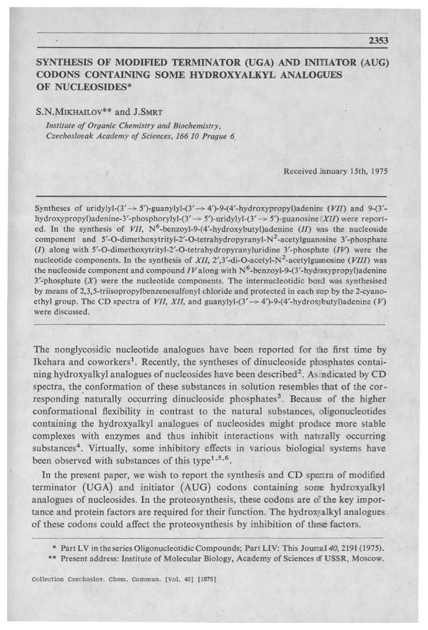 Synthesis of modified terminator (UGA) and initiator (AUG) codons containing some hydroxyalkyl analogues of nucleosides