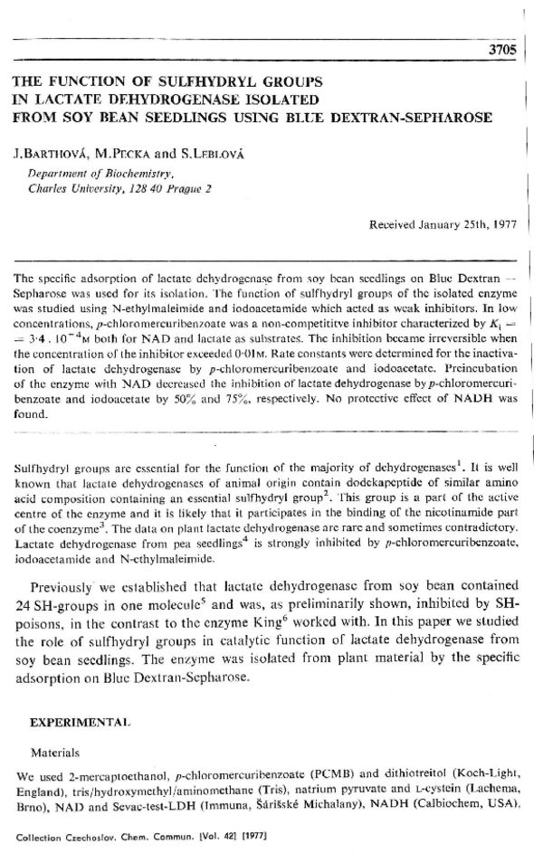 The function of sulfhydryl groups in lactate dehydrogenase isolated from soy bean seedlings using blue dextran-sepharose