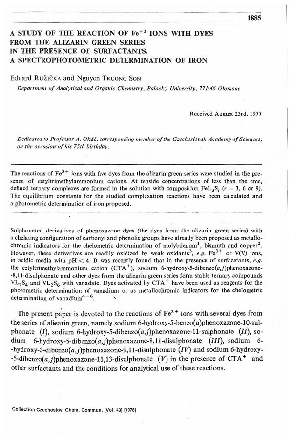 A study of the reaction of Fe+3 ions with dyes from the alizarin green series in the presence of surfactants. A spectrophotometric determination of iron