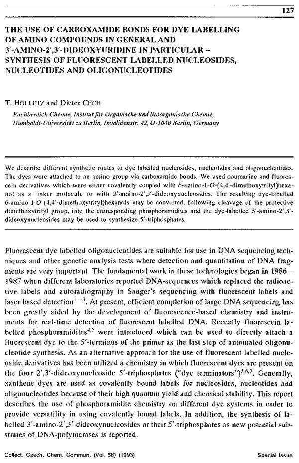 The use of carboxamide bonds for dye labelling of amino compounds in general and 3'-amino-2',3'-dideoxyuridine in particular - synthesis of fluorescent labelled nucleosides, nucleotides and oligonucleotides