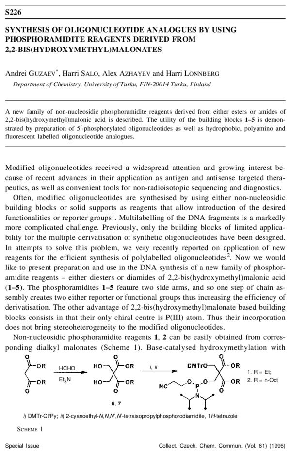 Synthesis of oligonucleotide analogues by using phosphoramidite reagents derived from 2,2-bis(hydroxymethyl)malonates