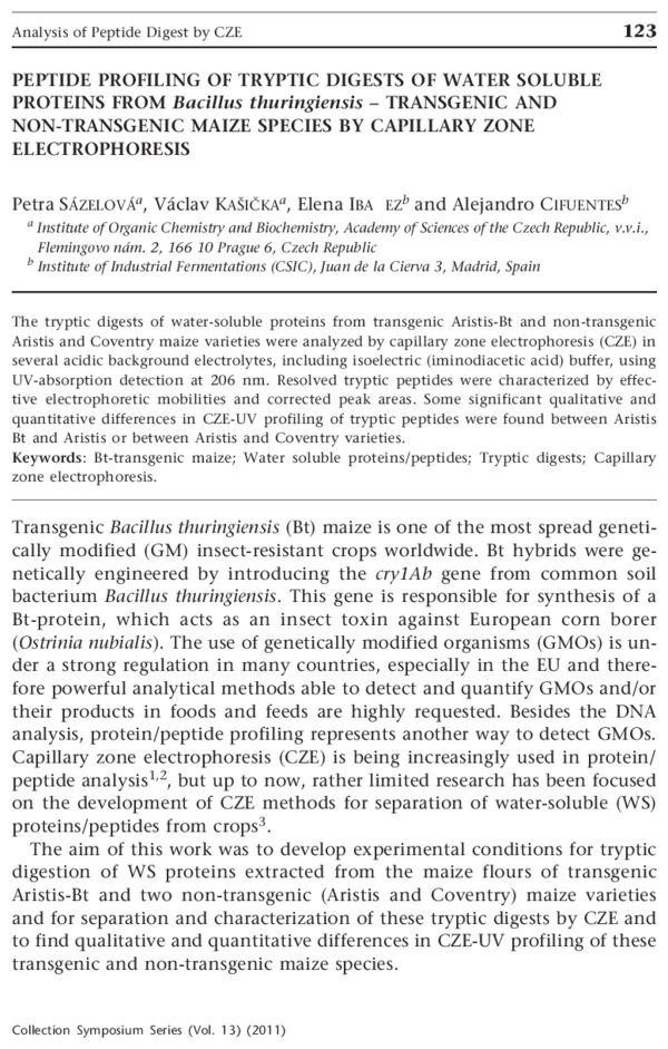 Peptide profiling of tryptic digests of water soluble proteins from Bacillus thuringiensis – transgenic and non-transgenic maize species by capillary zone electrophoresis
