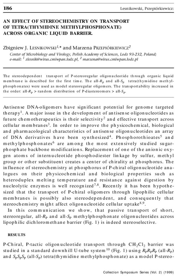 An effect of stereochemistry on transport of tetra(thymidine methylphosphonate) across organic liquid barrier