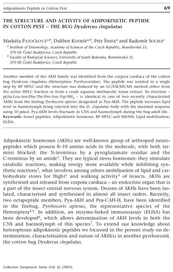 The structure and activity of adipokinetic peptide in cotton pest – the bug Dysdercus cingulatus